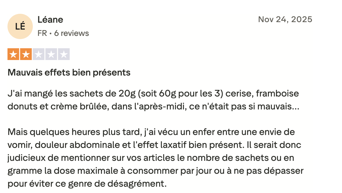 - Considéré comme laxatif au-delà de 10-15g (soit une portion un peu trop généreuse)