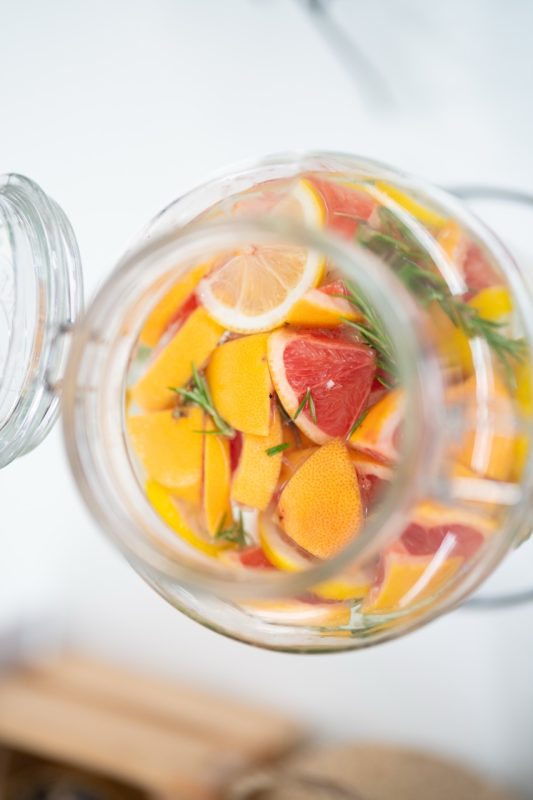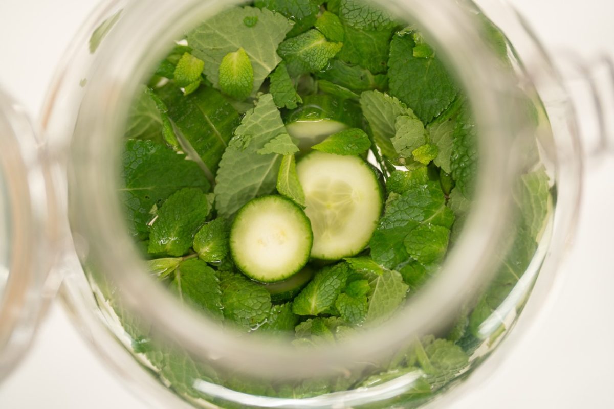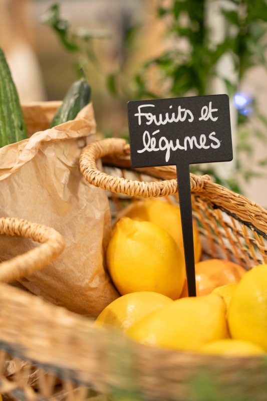 Direction artistique “petit marché” : une dominante végétale (à base de ruscus) et des accessoires d’étal (paniers, fruits/légumes, aromates, bocaux) appliqués sur les 4 guinguettes.
