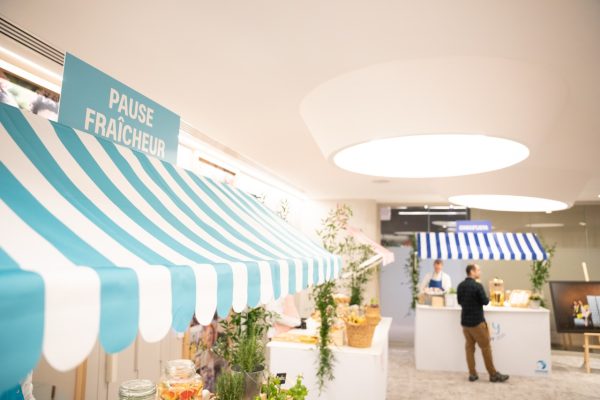 Nous avons transformé une pause “collation” en vrai moment de découverte, cohérent avec l’univers Danone : un petit marché scénographié, vivant, fluide… et délicieux.